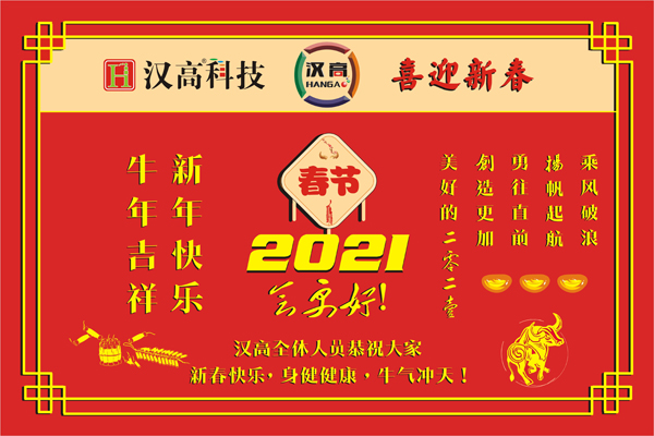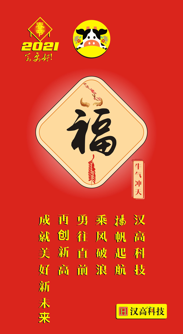 我們大力發(fā)揚(yáng)孺子牛、拓荒牛、老黃牛精神,以不怕苦、能吃苦的牛勁牛力,不用揚(yáng)鞭自?shī)^蹄,繼續(xù)為漢高事業(yè)辛勤耕耘、勇往直前,在新時(shí)代創(chuàng)造新的歷史輝煌!值新春佳節(jié)之際,祝大家身體健康、工作順利、闔家幸福、萬(wàn)事如意、牛年大吉、牛氣沖天!我們一起攜手,揚(yáng)帆起航,乘風(fēng)破浪,勇往直前,再創(chuàng)美好新未來(lái)!